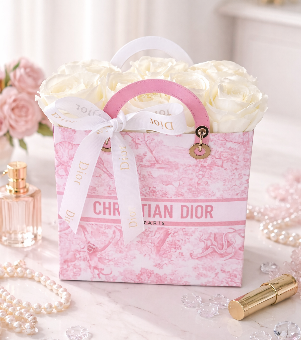 A luxurious arrangement of artificial ivory-white roses beautifully presented in a stylish Dior-inspired bag, finished with an elegant Dior ribbon. This timeless piece adds a touch of sophistication and charm to any space, making it the perfect gift or décor accent.