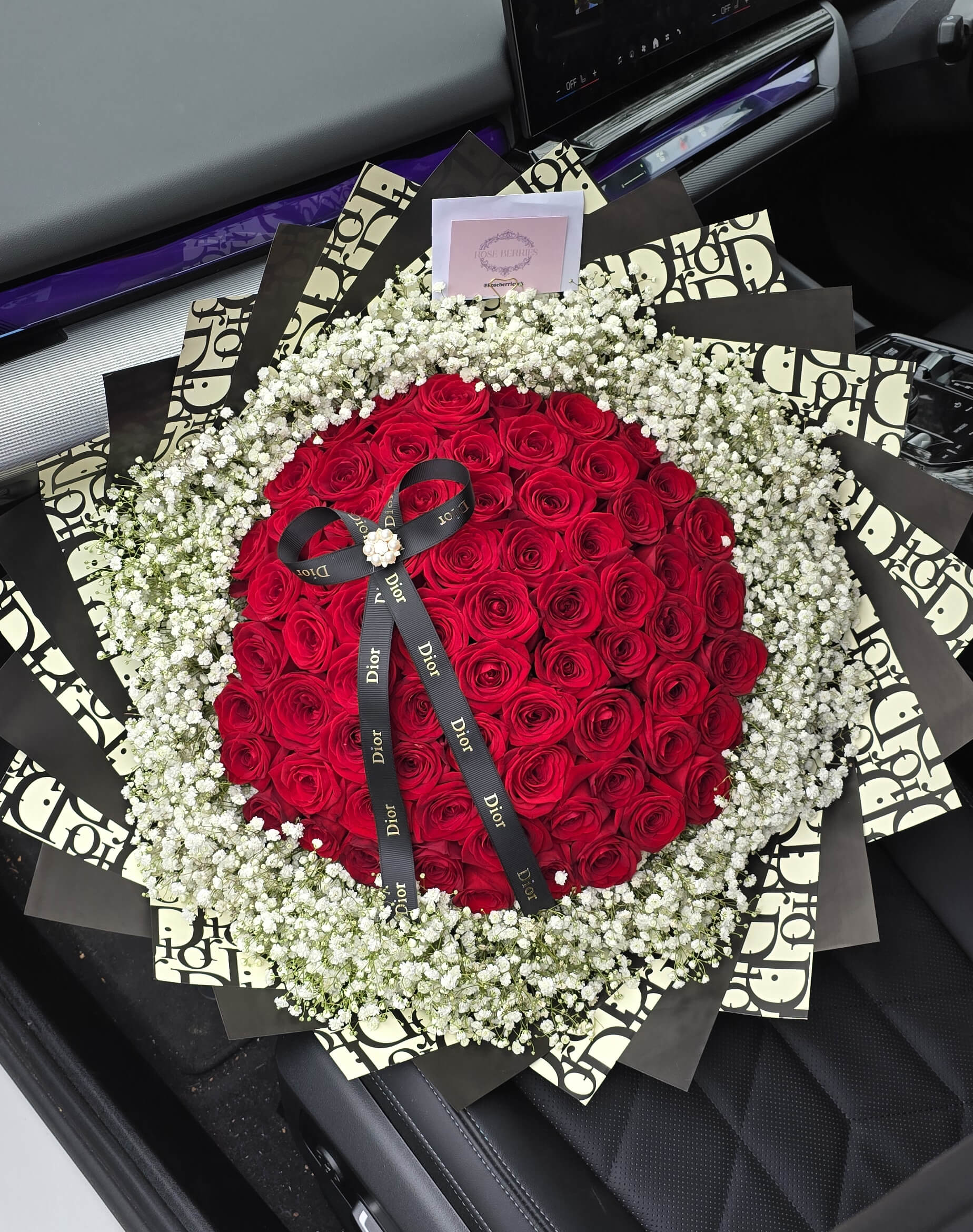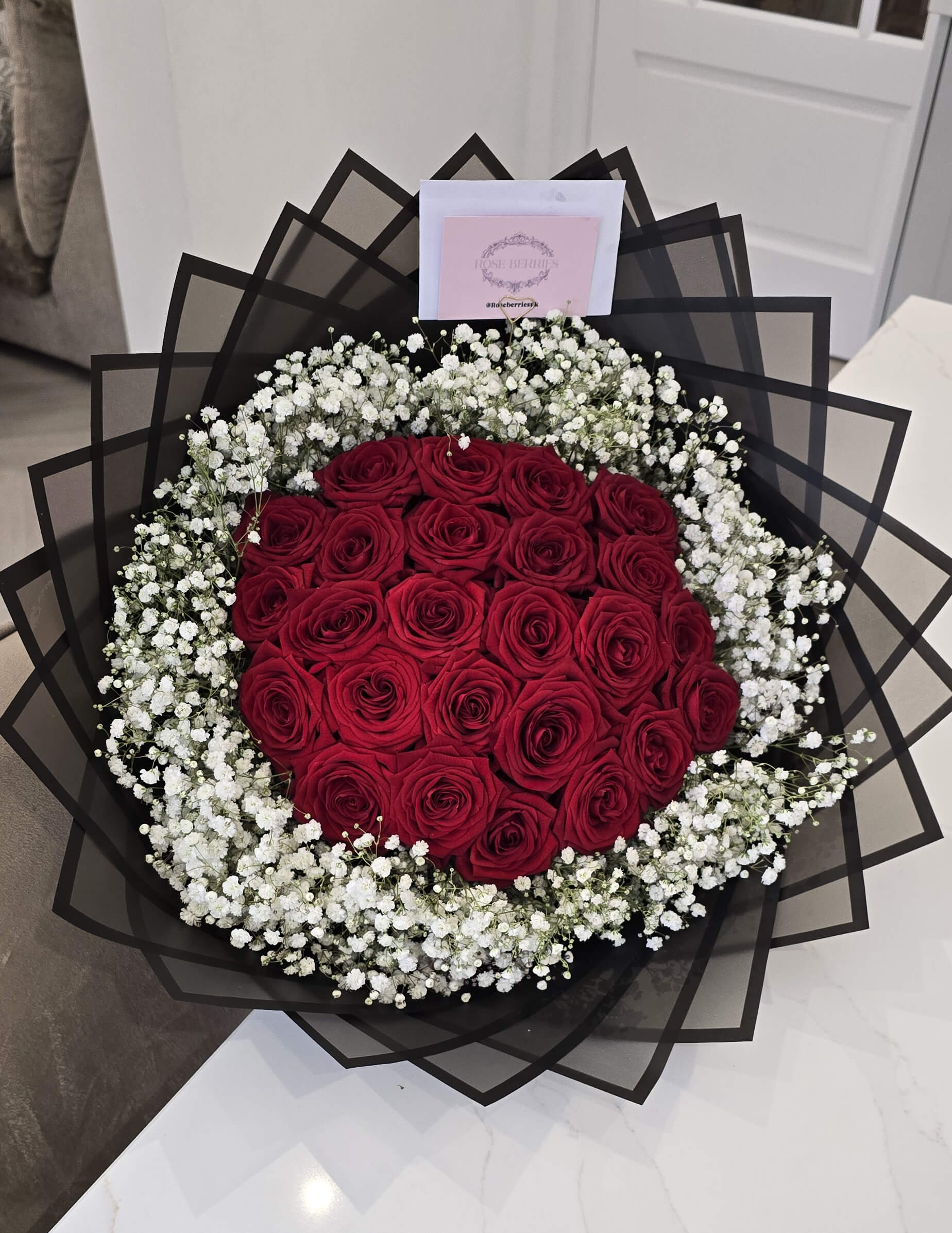 A Bouquet of Red Naomi roses with a white gypsophila rim exudes a perfect blend of luxury, romance, and delicacy.